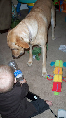 The other night after just finishing off a water bottle Braxton decided that it would make for a fun toy! I set him on the ground to allow for more space to play. Not more than a minute later I heard Nate say "Babe look - Braxton is playing with Chloee". I was a little confused as I looked down to find this.........